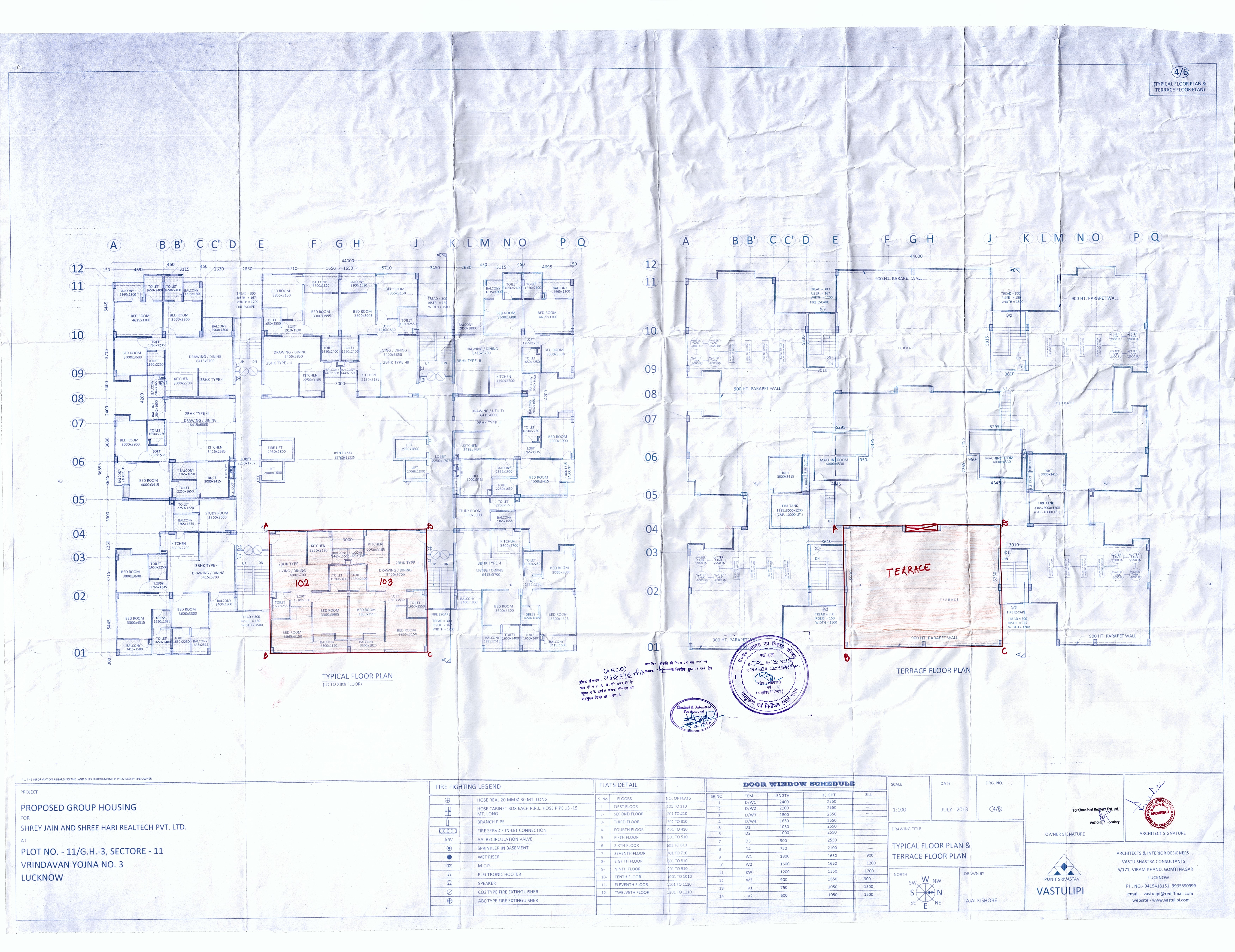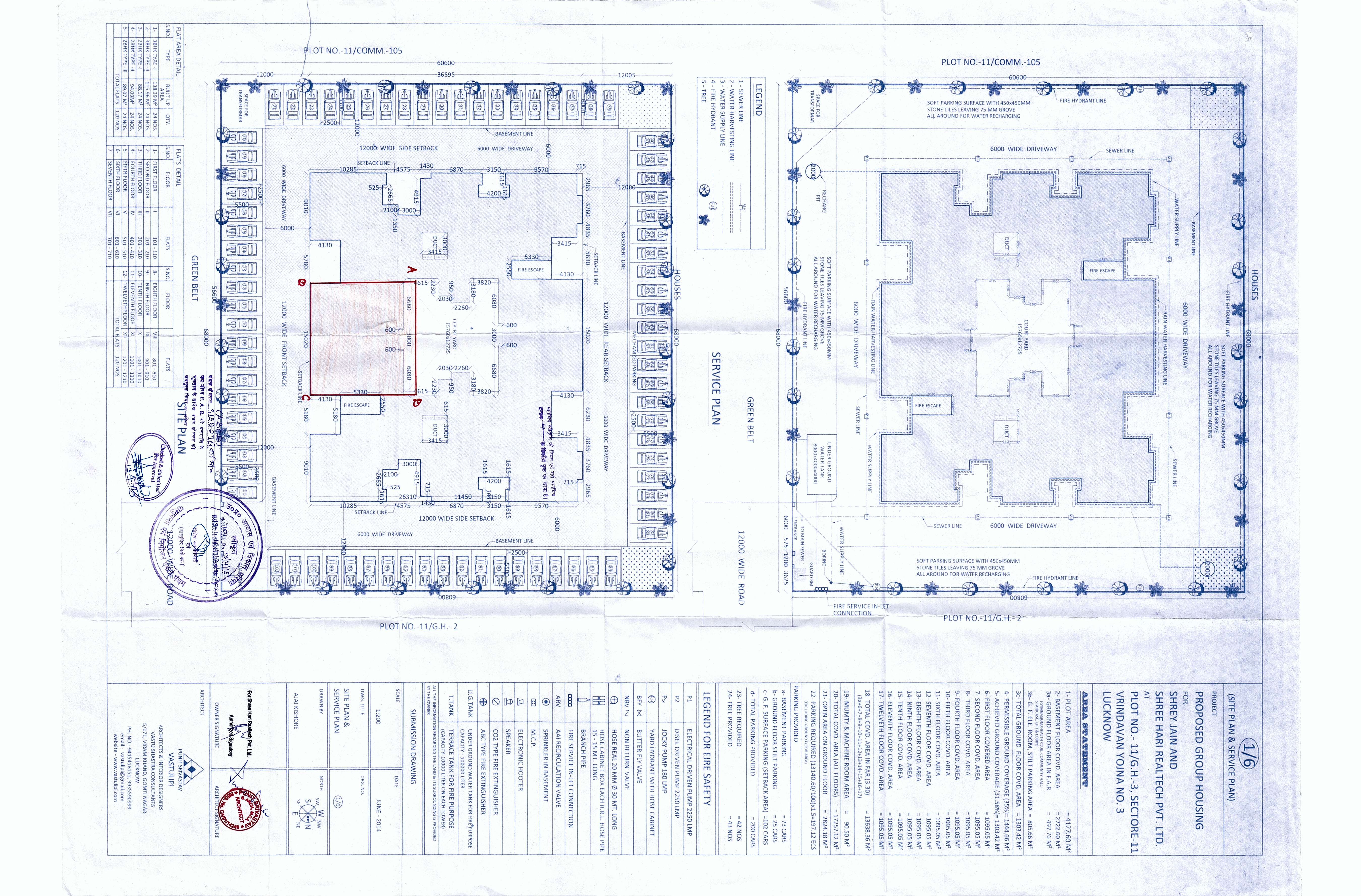 We have Proposed Common Pump Room with Primary filteration, Transfer pumps to fill the domestic overhead tank. Water for domestic use & Flushing go down through gravity from domestic as well as flushing tanks. All Sewage shall be connected to Municipal Sewerage system. Storm water for Roof, Roads and other area shall be connect to the Storm water drain channel to the Rain water harvesting Pit for recharging of Ground water and overflow shall be connected with municipal drain.