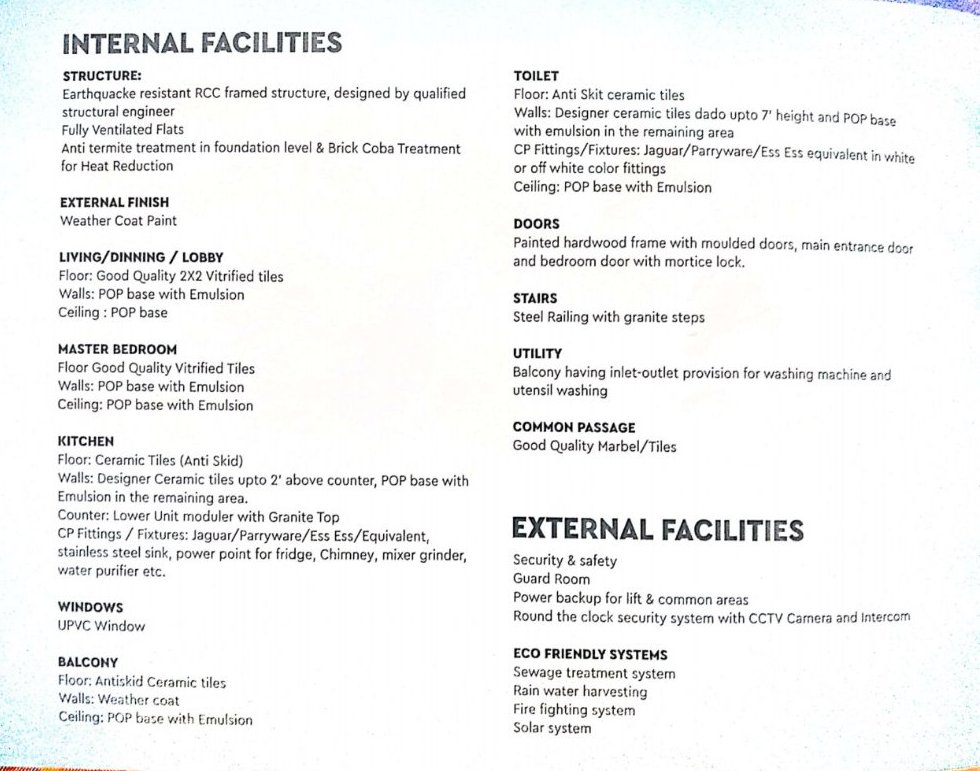 Two six passenger lifts, Machine room for those lifts, for supply of water in flats and campus, from overhead water tank, entry gate, provision of security system with CCTV camera and others essential services will be available in building.