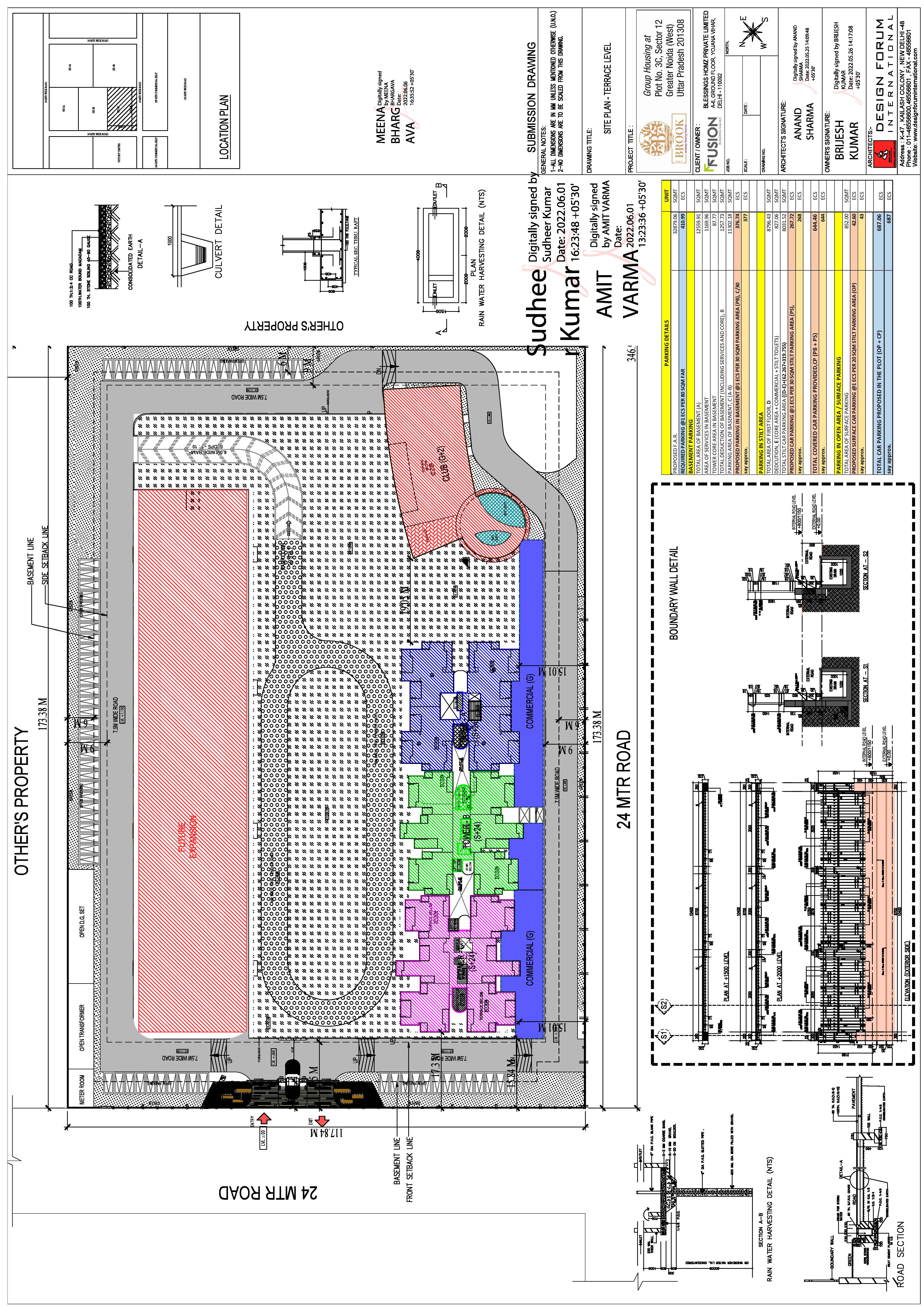 The project is demarcated with two roads each of 24mtr running along the South west Side and North West side of the plot. On the South East side it shares its boundary with Plot No. 4B and on the North East side with Plot No. 3B. The plot measures 117.84m in length and 173.38 metres in breath.